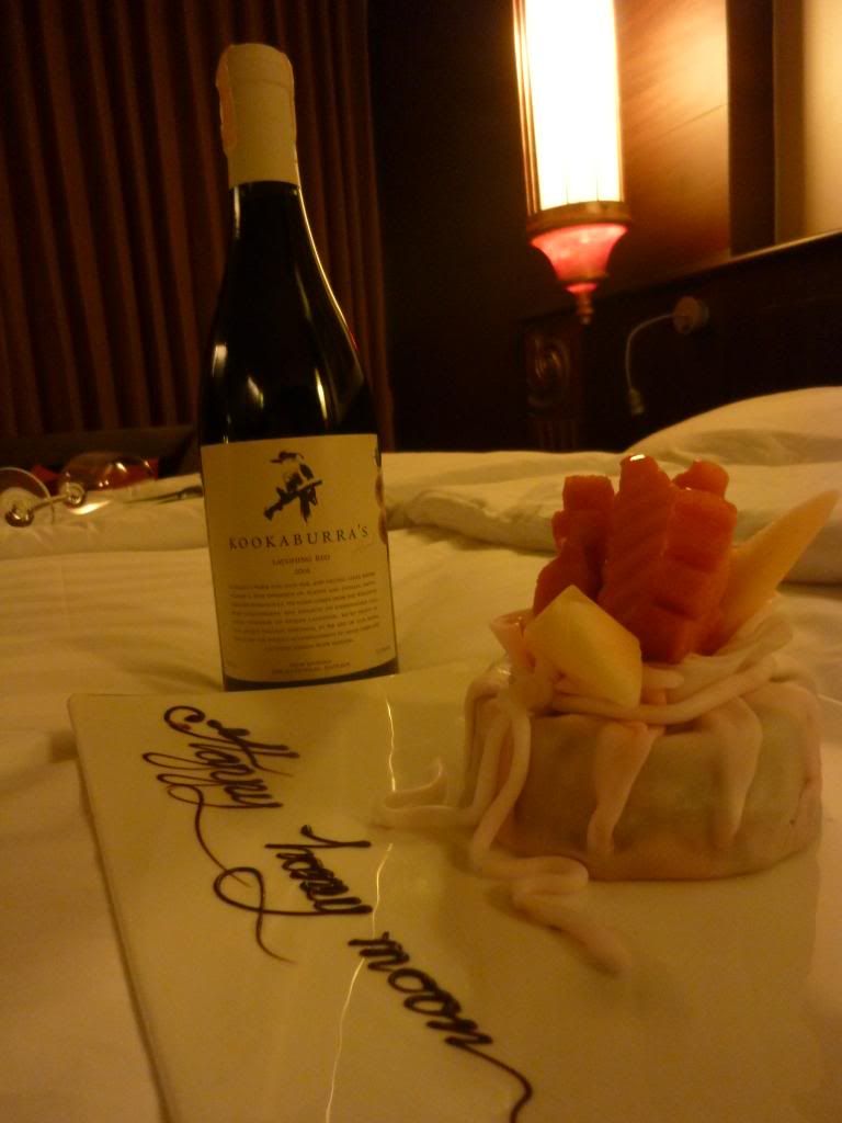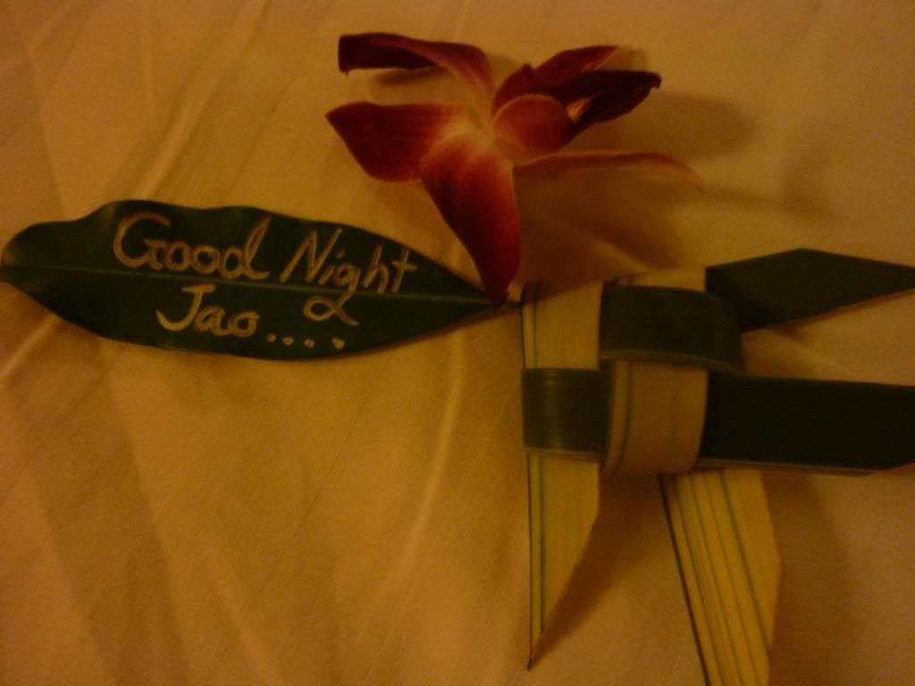 回到酒店,終於收到他們送的蛋糕和紅酒,還有窩心的晚安小魚和樹葉:Good Night Jao!