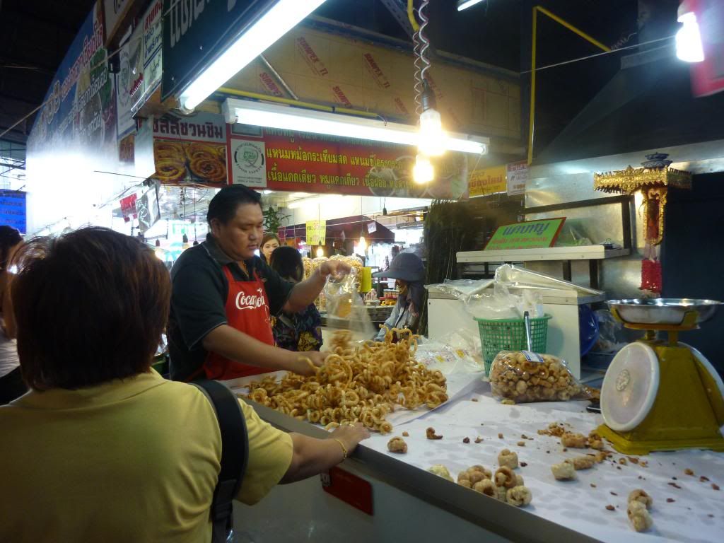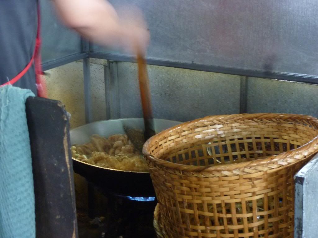 老師介紹完後,讓我們有15分鐘的自由時間。嘩!聞到陣陣的炸物香氣,原來有現做的泰北名產~炸豬皮!我想這店應該是品質佳的,炸好一圈圈的豬皮,很快便被大包大包地給買走,辛苦了啦,這位大哥汗流浹背的不斷地炸着。