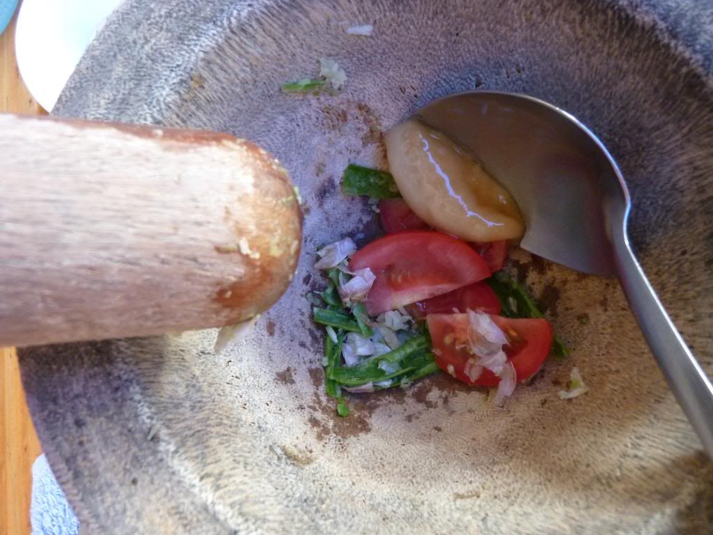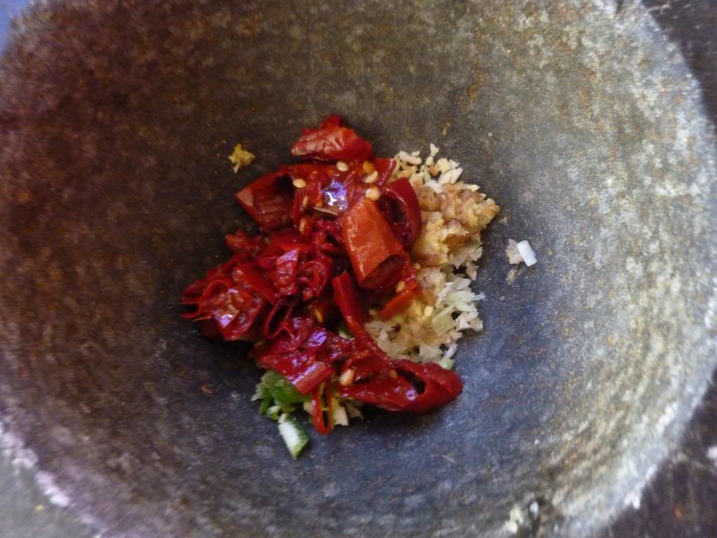 原來,要製成不同的咖喱,都有一個base,裡面會有kaffee lime skin、泰國蒜頭、香茅、蝦醬、芫荽頭、南薑、黃薑等。而各式各樣的咖喱就由這混合香料中再加以其他原素,像今天我做的泰北咖喱,就加再了用水泡過的乾紅椒、sweet basil和香茅。