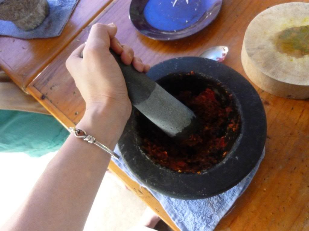 起初以為容易,原來要把混合香料磨杵得像醬料,要不停的用力去磨它,幸好,外邊忽然下起大雨來,否則大家就更加熱了。