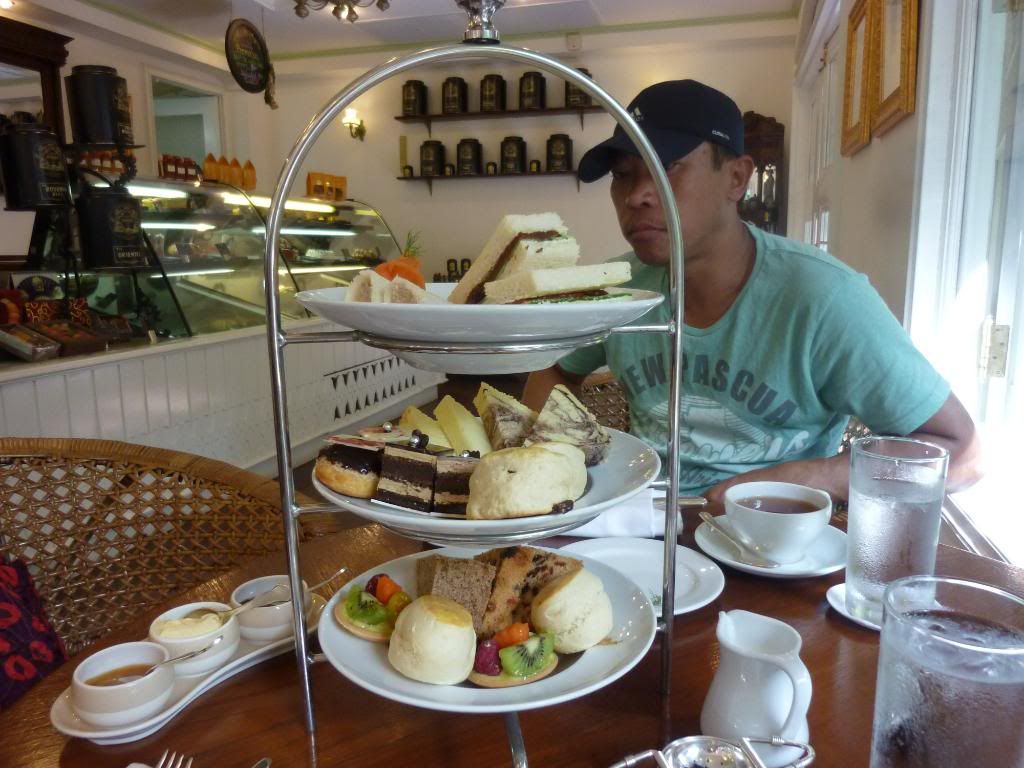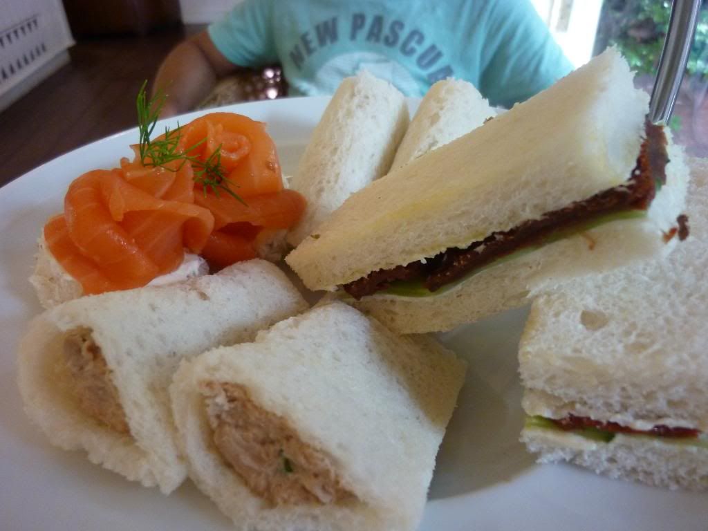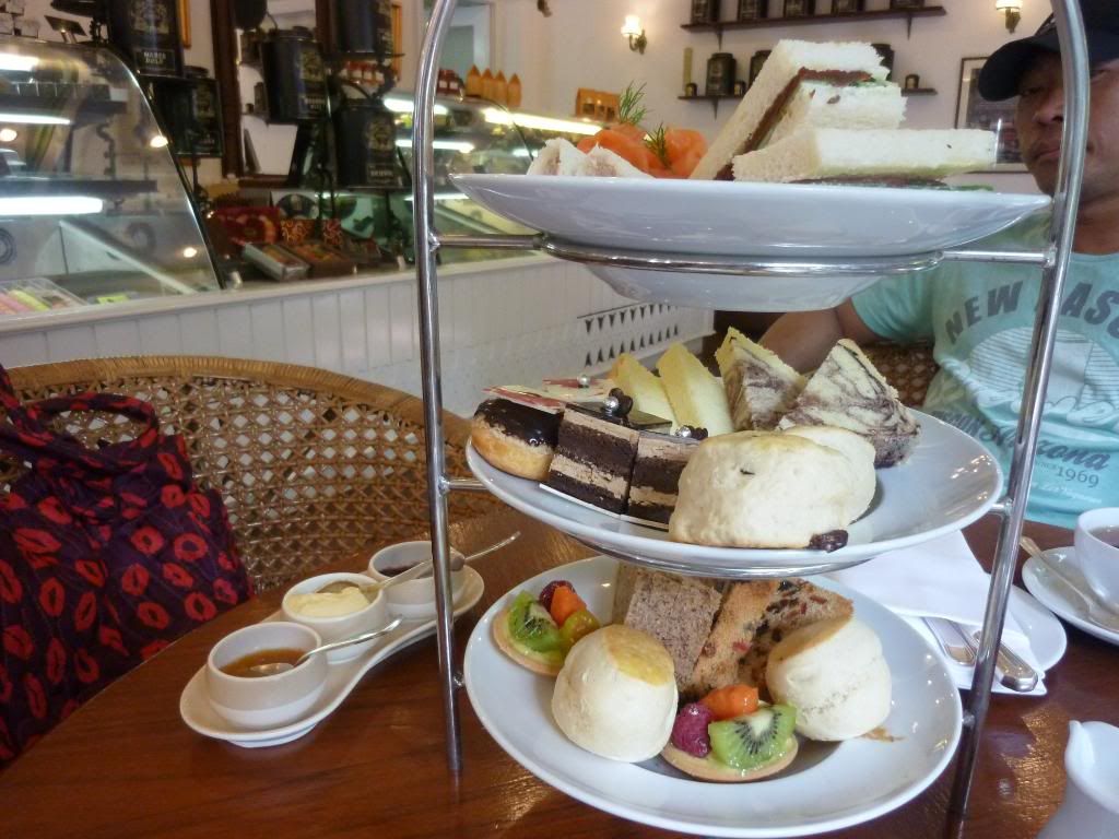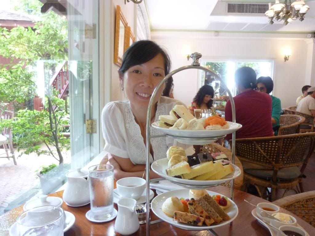 好,期待已久的英式下午茶已送上了。三層的精緻點心包括上層的煙三文魚卷、番茄乾及吞拿魚三文治。咦,怎麽有似曾相識的味道?對啦,有點像由曼谷往清邁的內陸機提供的餐點,一樣不太好吃...