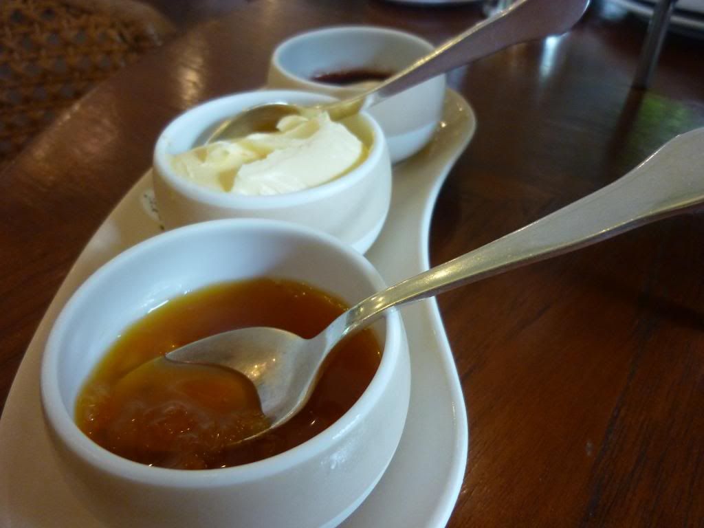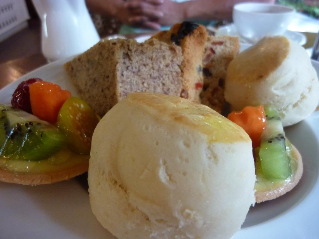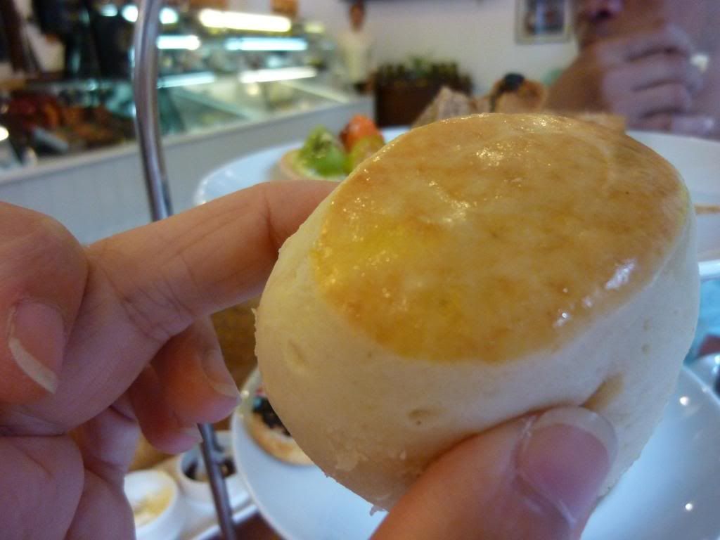 中層的迷你水果塔和現烘的鬆餅,伴以clotted cream、草莓和香橙果醬。我最喜歡的,竟然是平平無奇的鬆餅,扎實的口感、溫暖的熱度和錦上添花的佐料,實在令我忍不住吃了兩件。要知道這世界最美味的東西也是最可惡的,就像這簡單的cream,充滿濃濃的奶香和牛油味,也就令我不住的往鬆餅上塗。