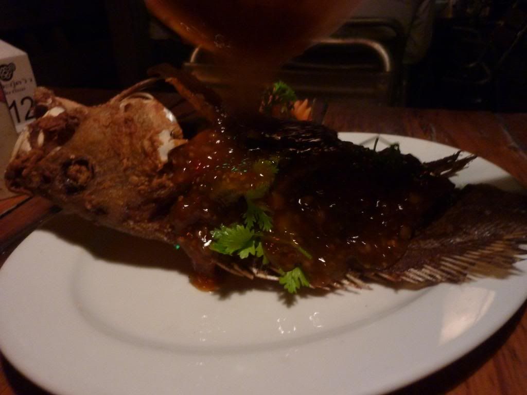 怎樣啦?我點的炸石斑魚像極了受到核副射處理過一樣,樣子醜極了。而我要的青檸檬香茅汁,怎麽又變為辣椒汁呢....算了啦!不過,有能耐可以將魚肉炸成魚乾,的確厲害!