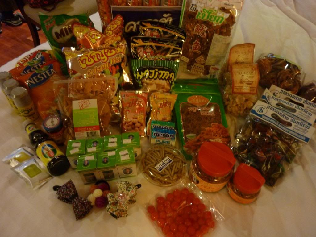 想不到Spa的前台人員說會安排車子送我回飯店,太體貼啦!回到Siripanna,將今早在Warorot和Big C買的東西來個大合照,Cheers!