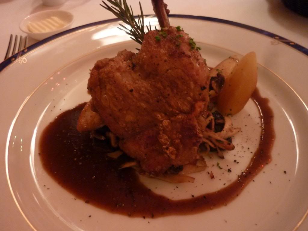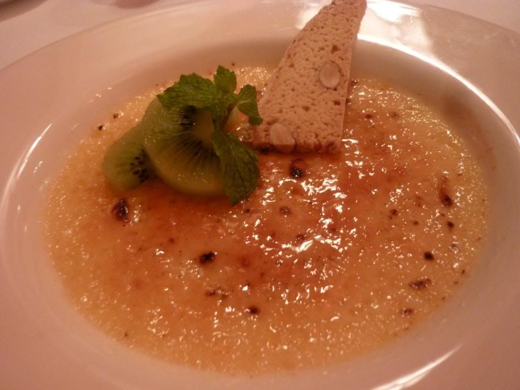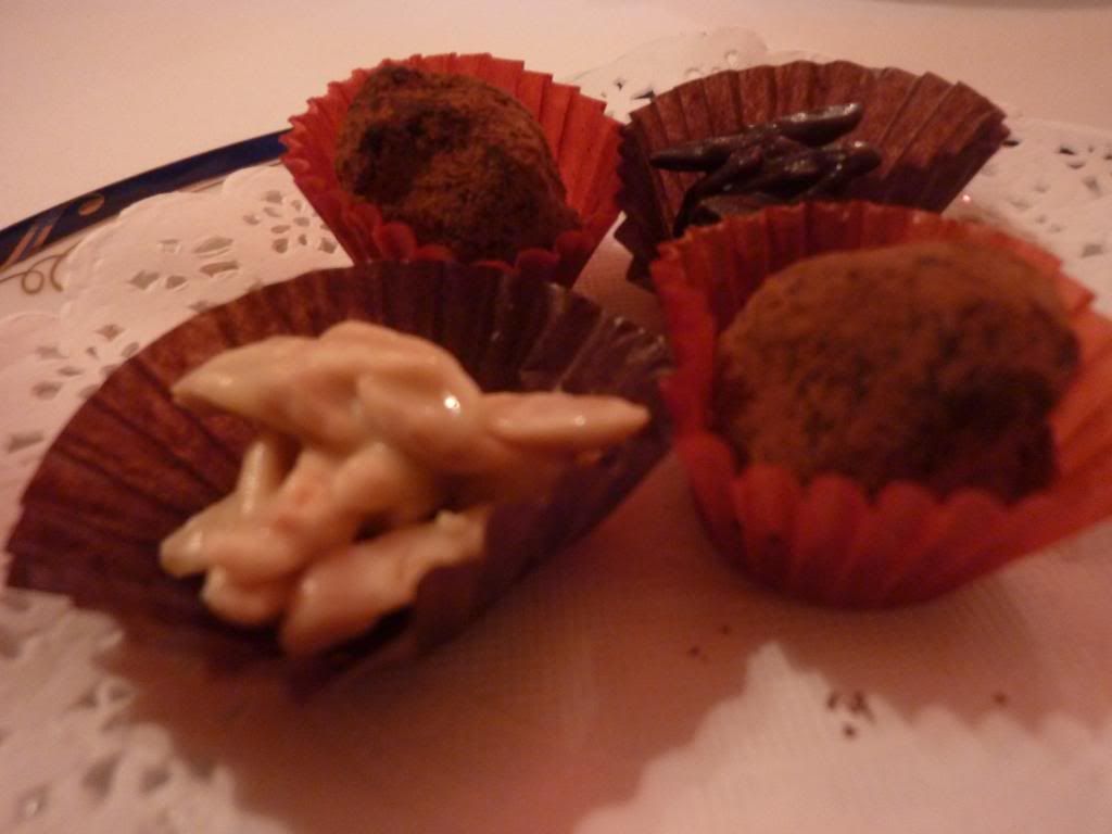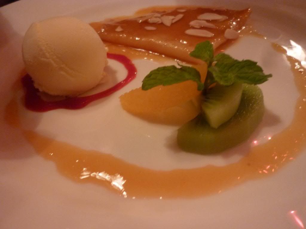 Creme brulee,Crepe Suzette and Petit Four,我從未吃過那麼大的焦糖燉蛋呢!上面的焦糖很厚也很脆,要老公幫我吃了一大半才成了!味道不錯啊,只是自己太飽而已。老公的橙酒煮薄餅也很道地,賣相又漂亮,難得不會太重酒味和沒帶半點苦澀味。最後,還送上自家製的巧克力petit four,這個嘛...阿Vi絕對抗拒不了巧克力的誘惑,濃濃的可可和牛奶的幼滑,再加上可口的果仁...還好,老公已吃了一半,要不然又給我幹掉了。