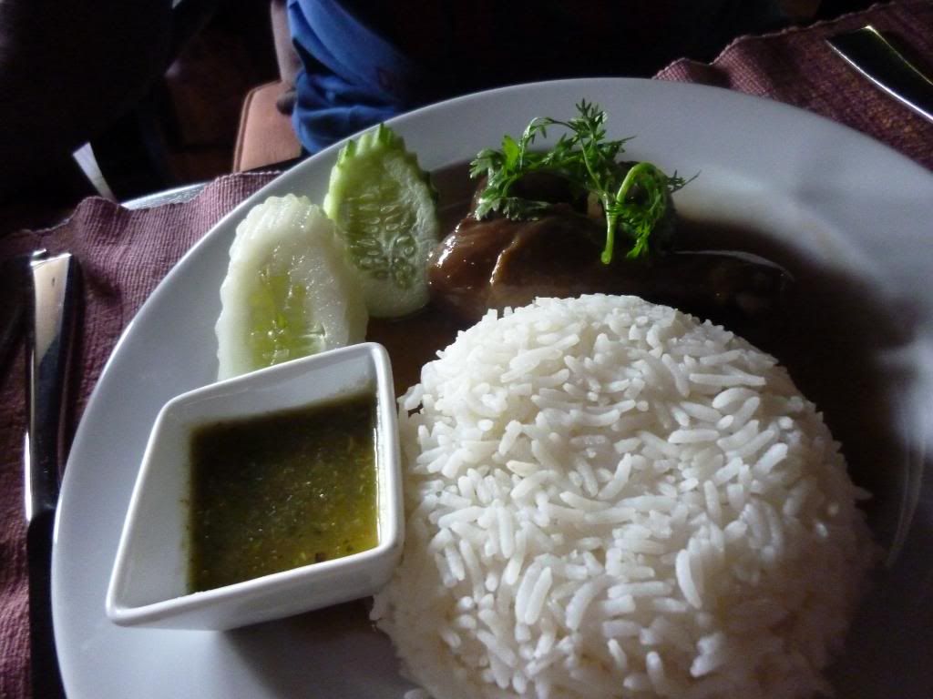 這的午餐做優惠中, 食物都由$69bhat起, 我點了raad na moo泰式濕炒豬肉河粉, 老公點了khao man gai鷄肉飯...但怎麼飯變了很港式的感覺?