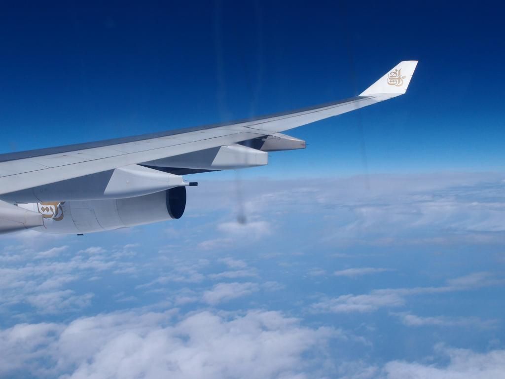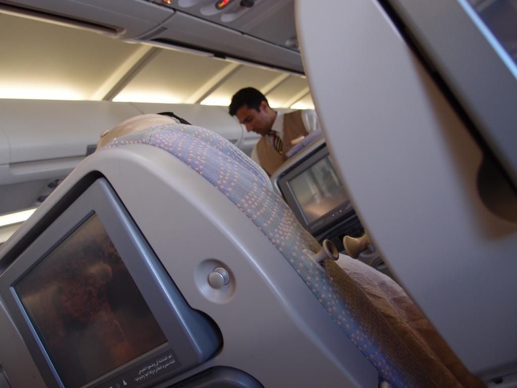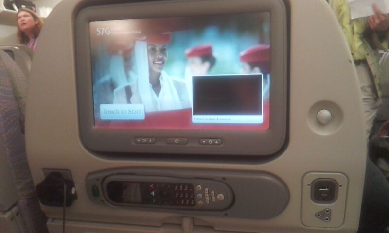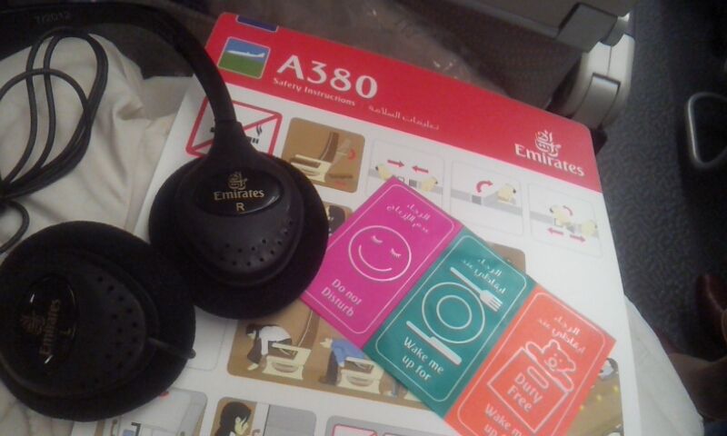 往中轉站的第一程航班在零晨00:35開出, 約9小時到達迪拜。A380 economy class的坐位呢, 還不是和坐泰航一樣的寬度, 只是加上更多的坐位吧...空服小姐都打扮得美美的,尤其是鮮艶的口紅令我印象深刻。上機前知道有wifi service, 原來是要另外收費的。幸好Emirates Air Entertainment種類極多, 睡不著大概可以看4、5部電影呢!