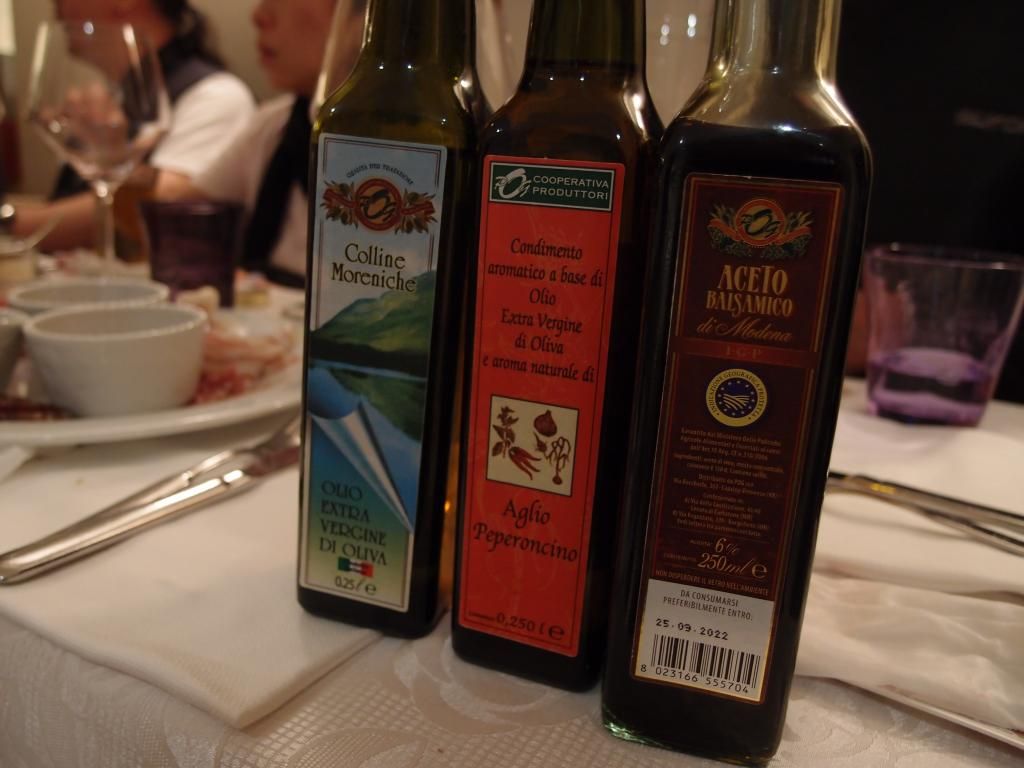 桌上放着的調味三寶 : 特純橄欖油、香蒜辣椒橄欖油和黑醋。