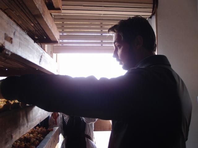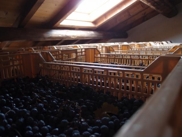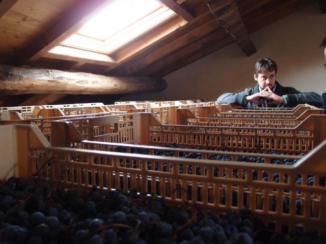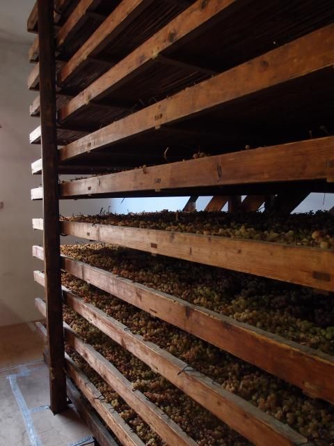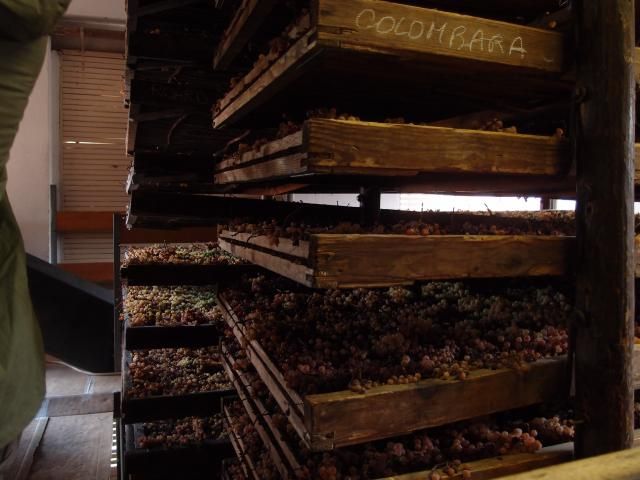 先參觀2012年度夏季採摘的葡萄, 它們都被放在這小山上, 乾燥而低溫的天然風乾室內。叠得高高的架上, 有體型已縮少了一半、然而甜度更濃郁的紅葡萄。Andrea說他們這只有11名員工, 採收的季節大家都忙得透不過氣來。