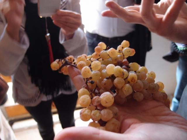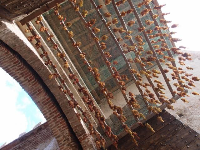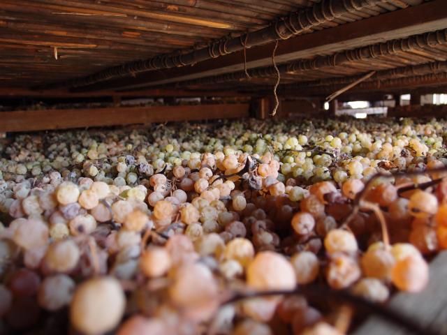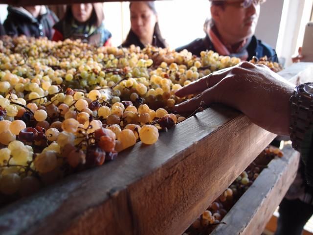 爬上二、三樓, 就是酒莊風乾白葡萄的寶藏。想不到他們會用上過百年歴史的竹牌來盛起串串的乾葡萄呢! 由於這區天氣全年都比較乾燥, 半山上的地方只須把窗户打開便可以好好的利用大自然的風去令葡萄的風味更濃厚、甜度提升。