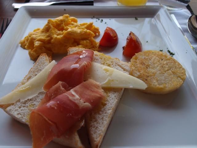 我的西班牙式有沾過橄欖油的烘麵包, 伴以Serrano Ham, 西班牙羊奶芝士Manchego Cheese和炒蛋。