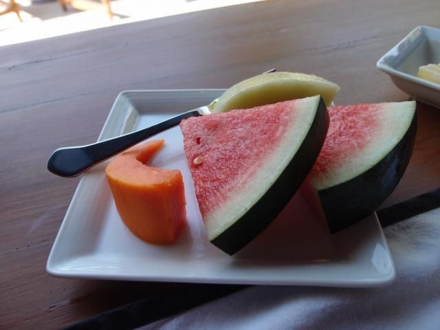 我們分別點了英式和西班牙式早餐, 都先送上小份的水果盤, 還有甜得要命的果汁和咖啡或茶。