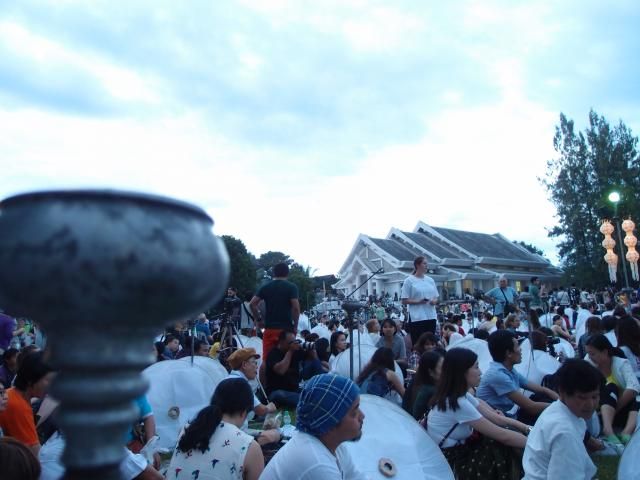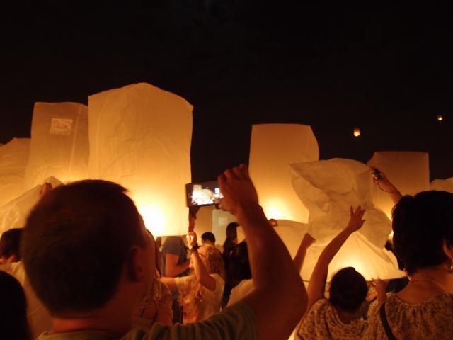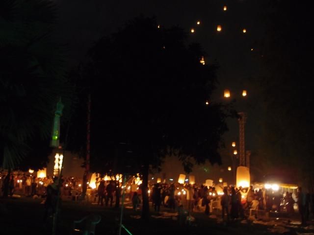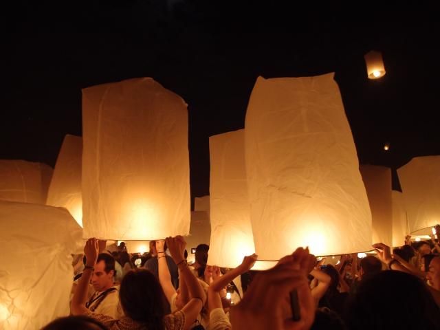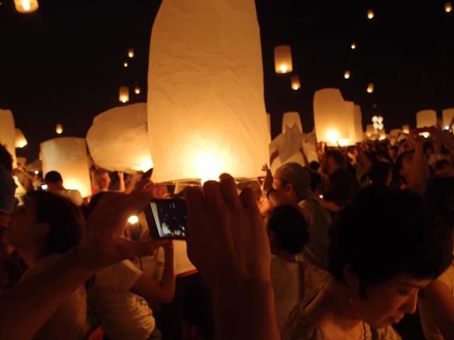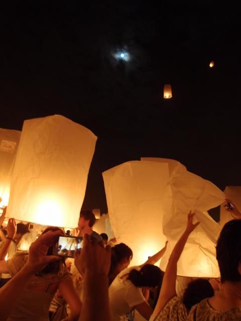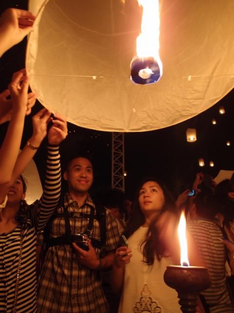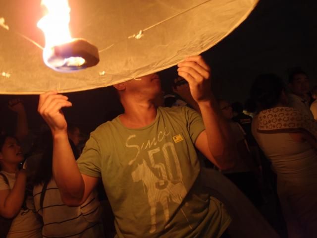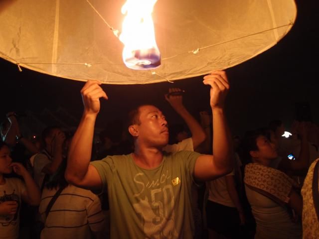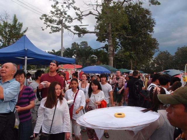 才不過半小時吧, 埸地比之前更多人了。不知所措的我, 只好讓老公悠然自得的在嘆他的炸雞, 說在哪放都沒所謂...不可以啊! 我們不是期待了兩年的嗎? 而且為了今次天燈之旅用了比較多的時間上網去找資料、看遊記, 也請教了我的清邁遊達人朋友Jane和糖糖...不可以就此作罷!