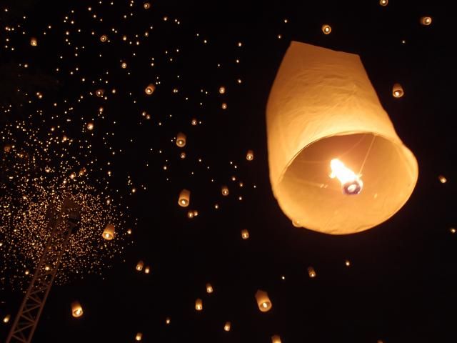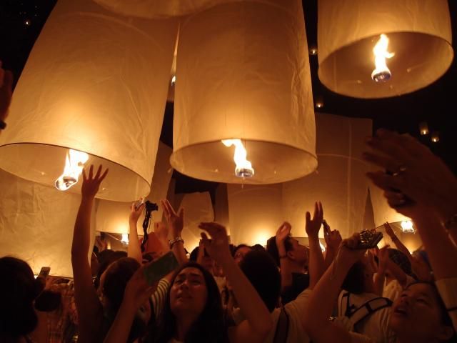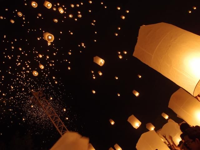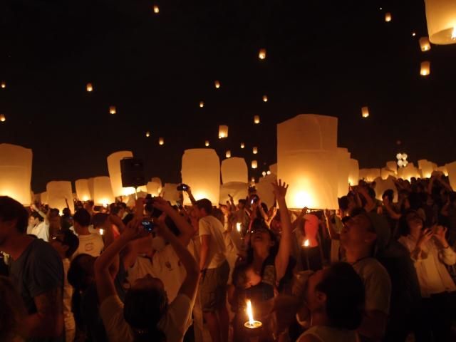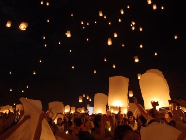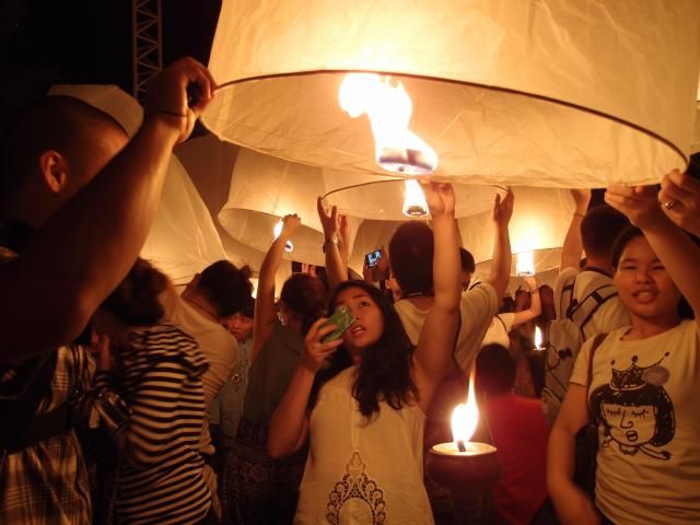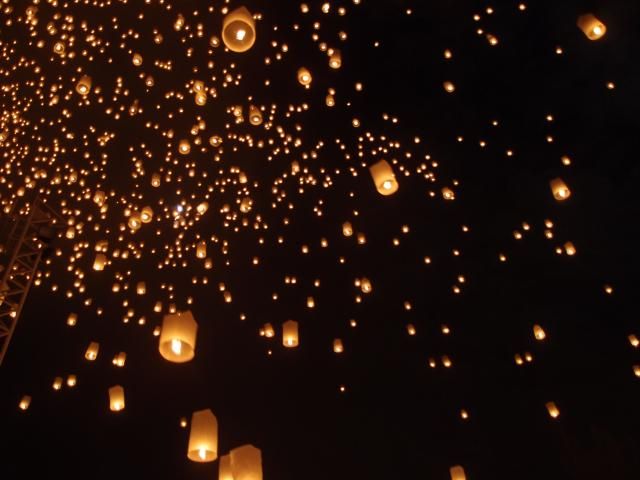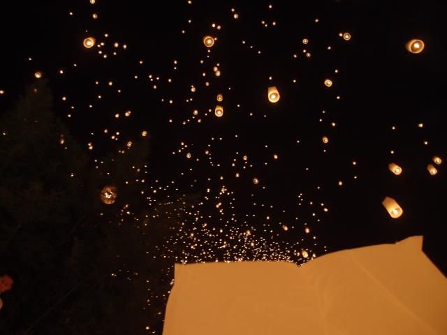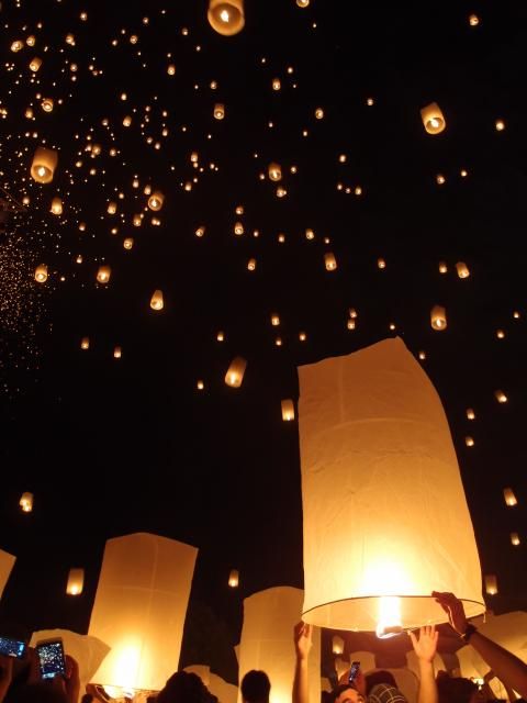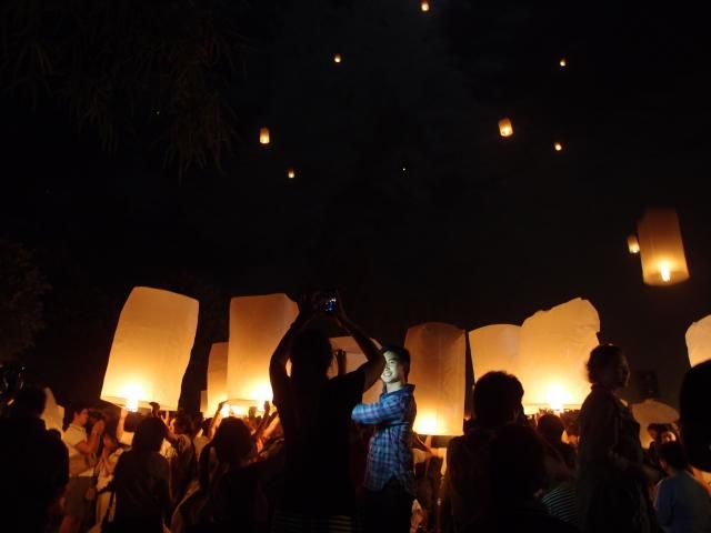 才不過半小時吧, 埸地比之前更多人了。不知所措的我, 只好讓老公悠然自得的在嘆他的炸雞, 說在哪放都沒所謂...不可以啊! 我們不是期待了兩年的嗎? 而且為了今次天燈之旅用了比較多的時間上網去找資料、看遊記, 也請教了我的清邁遊達人朋友Jane和糖糖...不可以就此作罷!