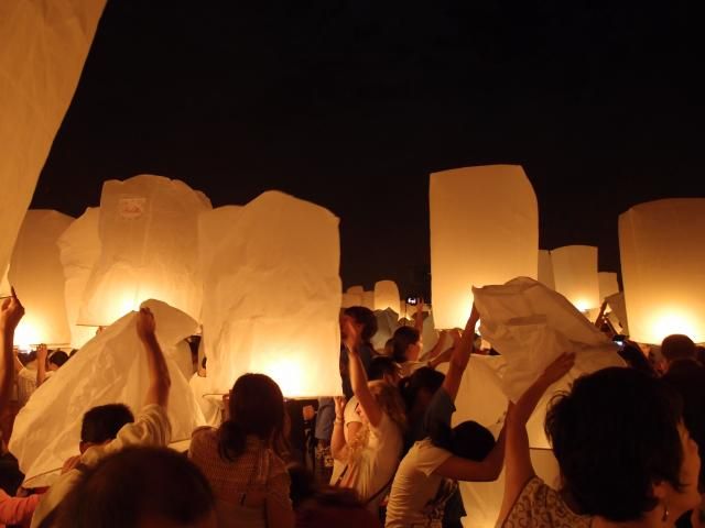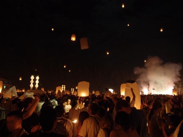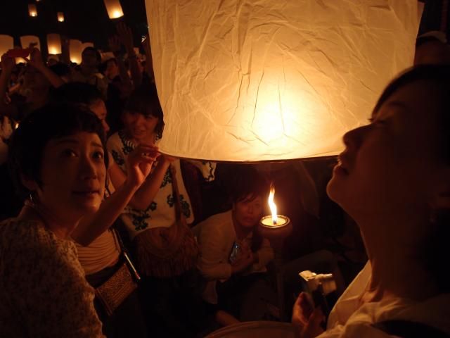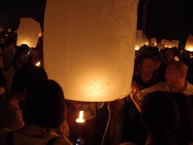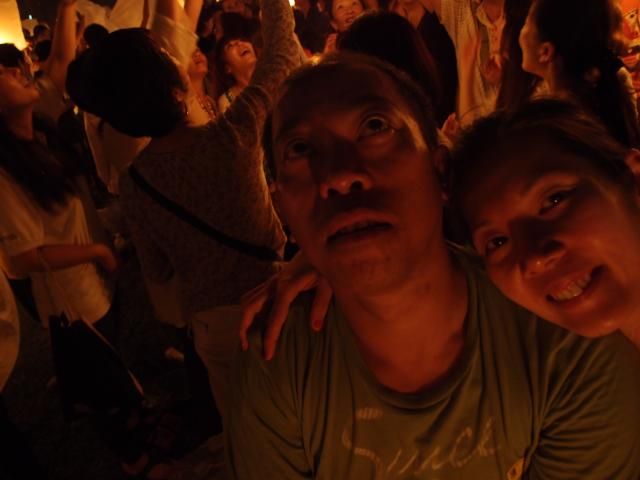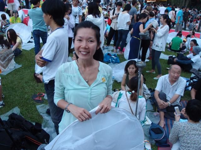 不放棄的我, 不死心的進埸內搜索有否可以容納我倆的空間。感謝上天! 我也很順利的在三位日本女士旁邊, 請求一會待她們放完天燈後隨着玩。老公還在埸外享受他的美食之際, 倒很驚訝我那麼快就找到位置。也就跟著我進場裡去。
