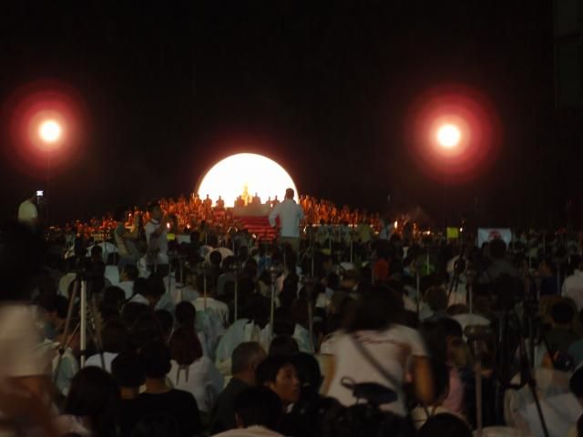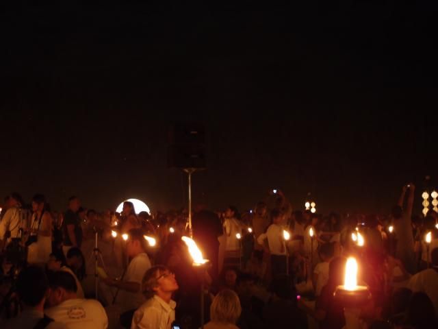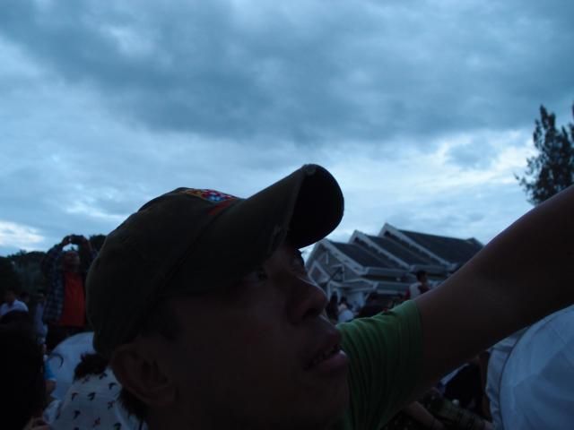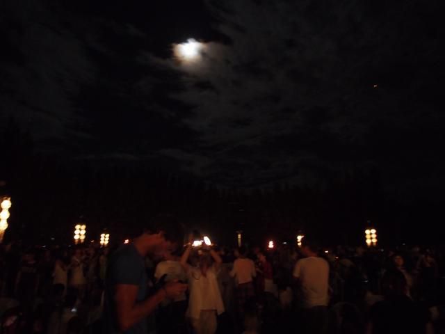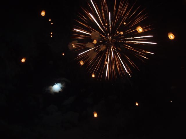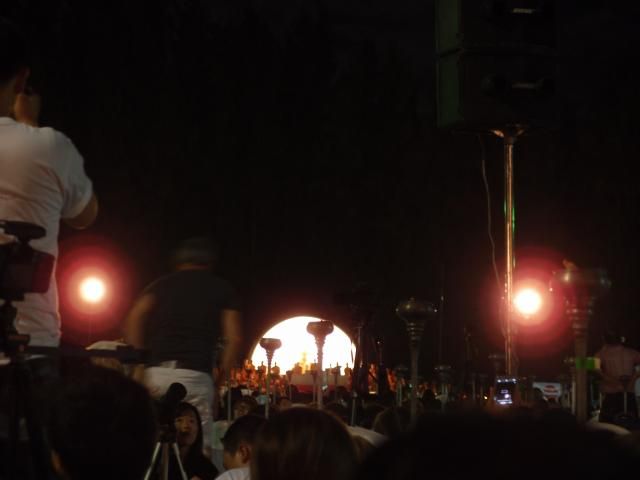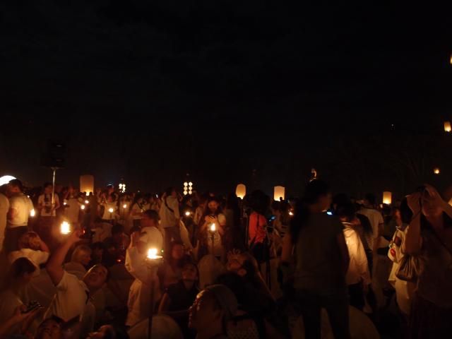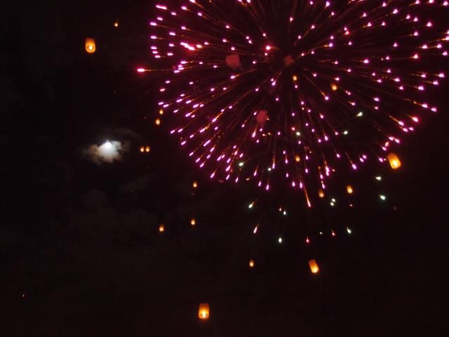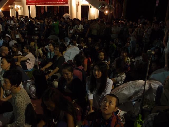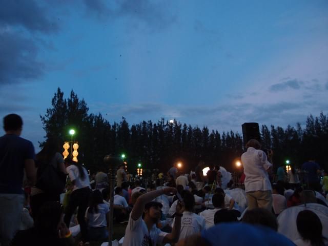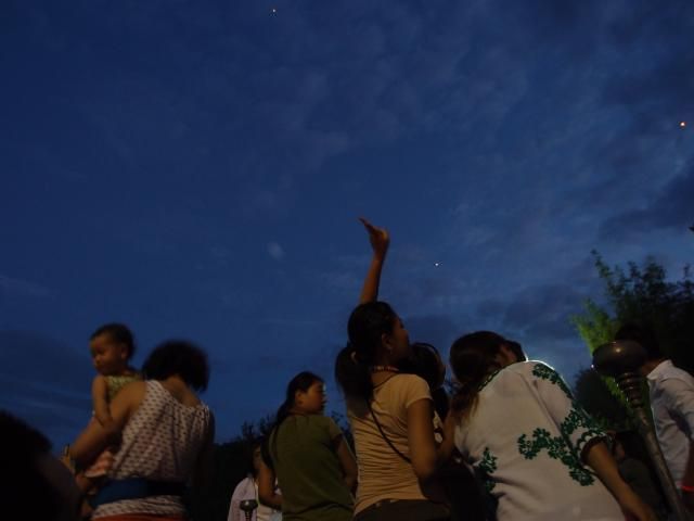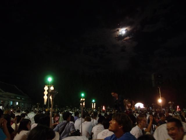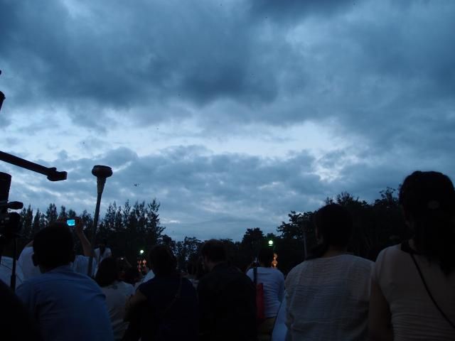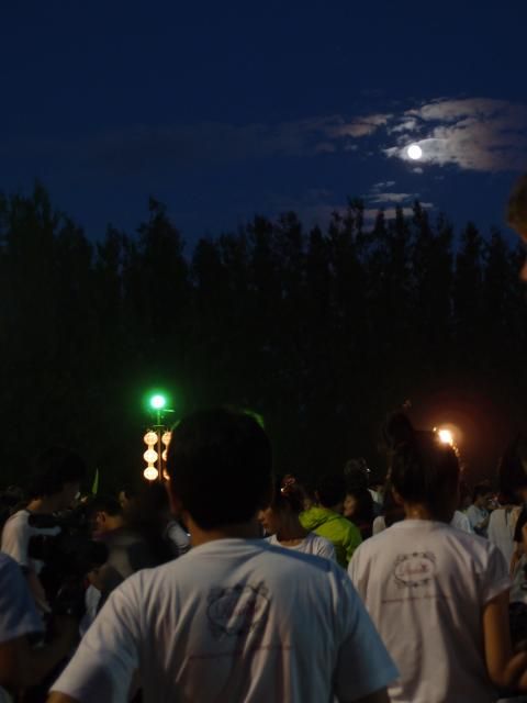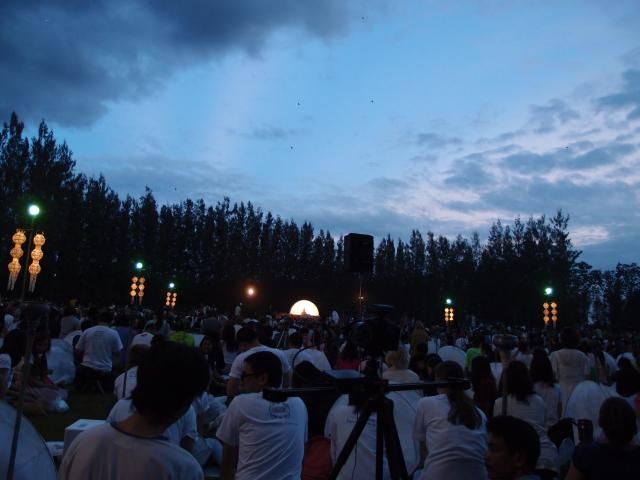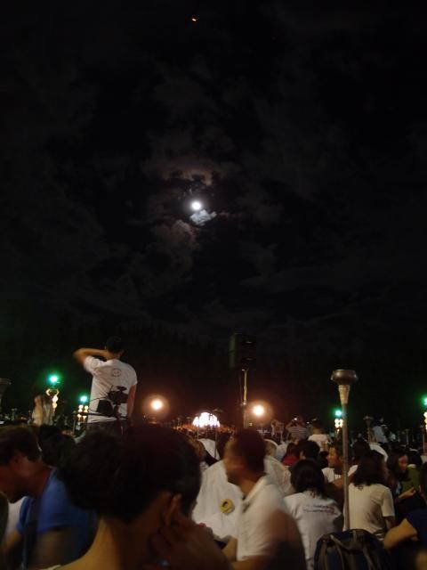 八時許, 人們開始起立。大會在講解放天燈的程序之際, 月亮就從厚雲中扒出來, 從外頭放的天燈也像浮動在海上的水母一樣...