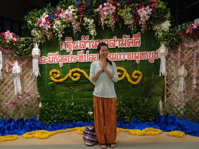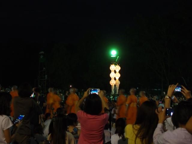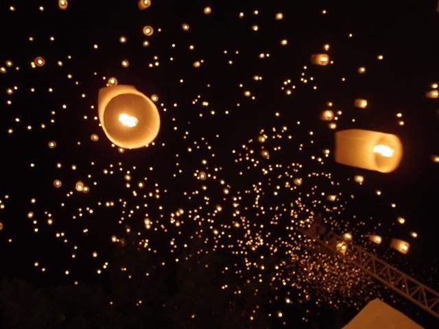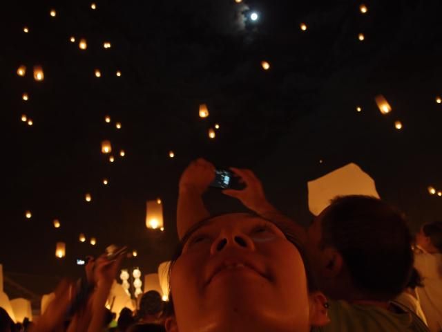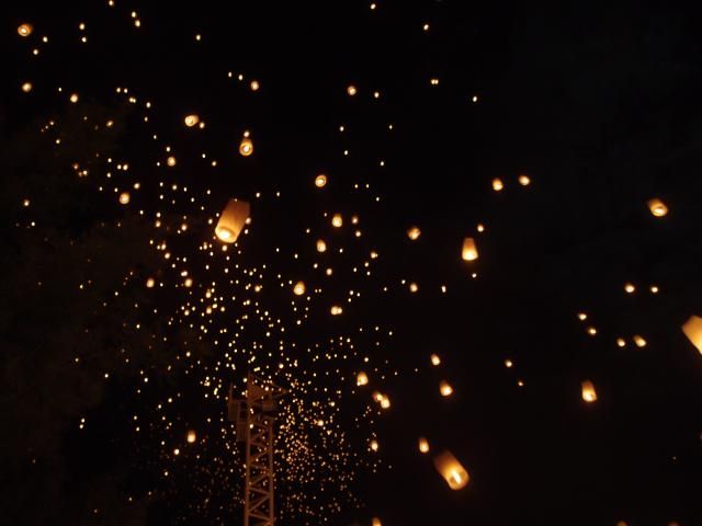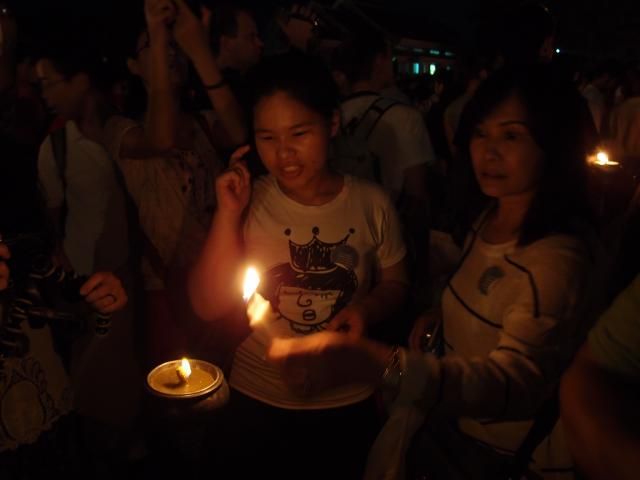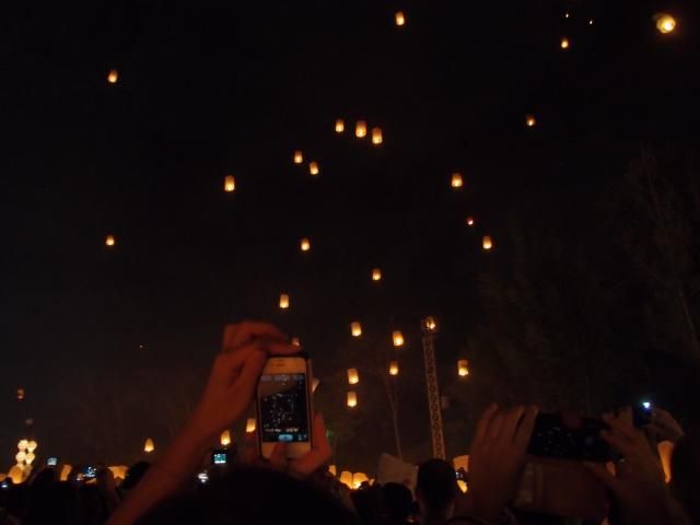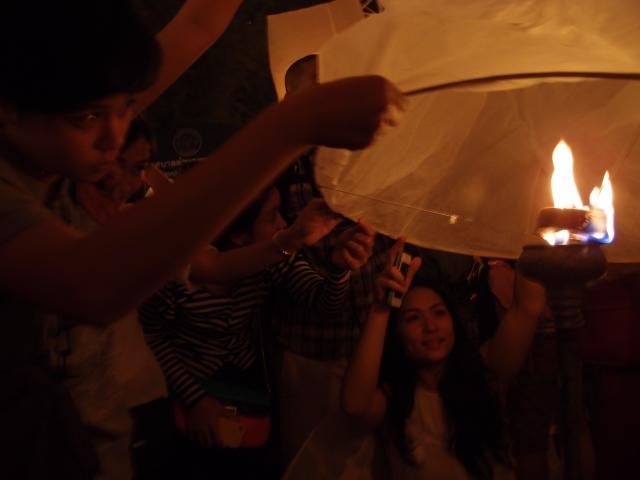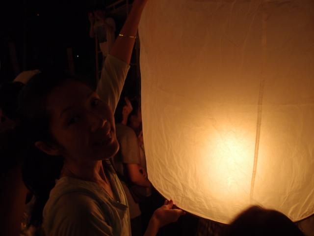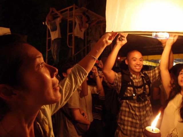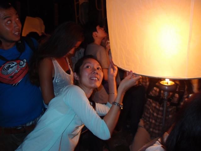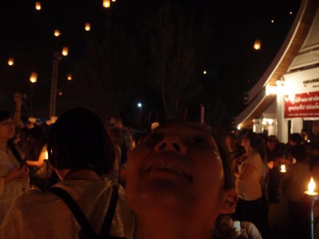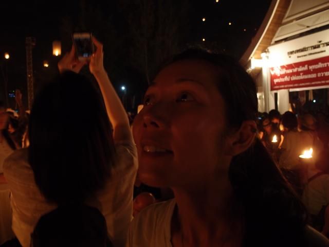 不遠處就見到我們"J"車的領隊小天, 問之下, 原來她到達後也沒有吃過什麼, 我連忙把未吃的小食都給她了。也因為要安排車輛和接待事宜, 萬人天燈的盛況就和她完全相隔, 多可惜啊! 才二十二歲的本她泰國人小天, 卻可說得一口流利的國語, 也會寫簡單的中文, 樂天的她, 在中國遊客日增的清邁一定可以有成功的日子, 祝福她!